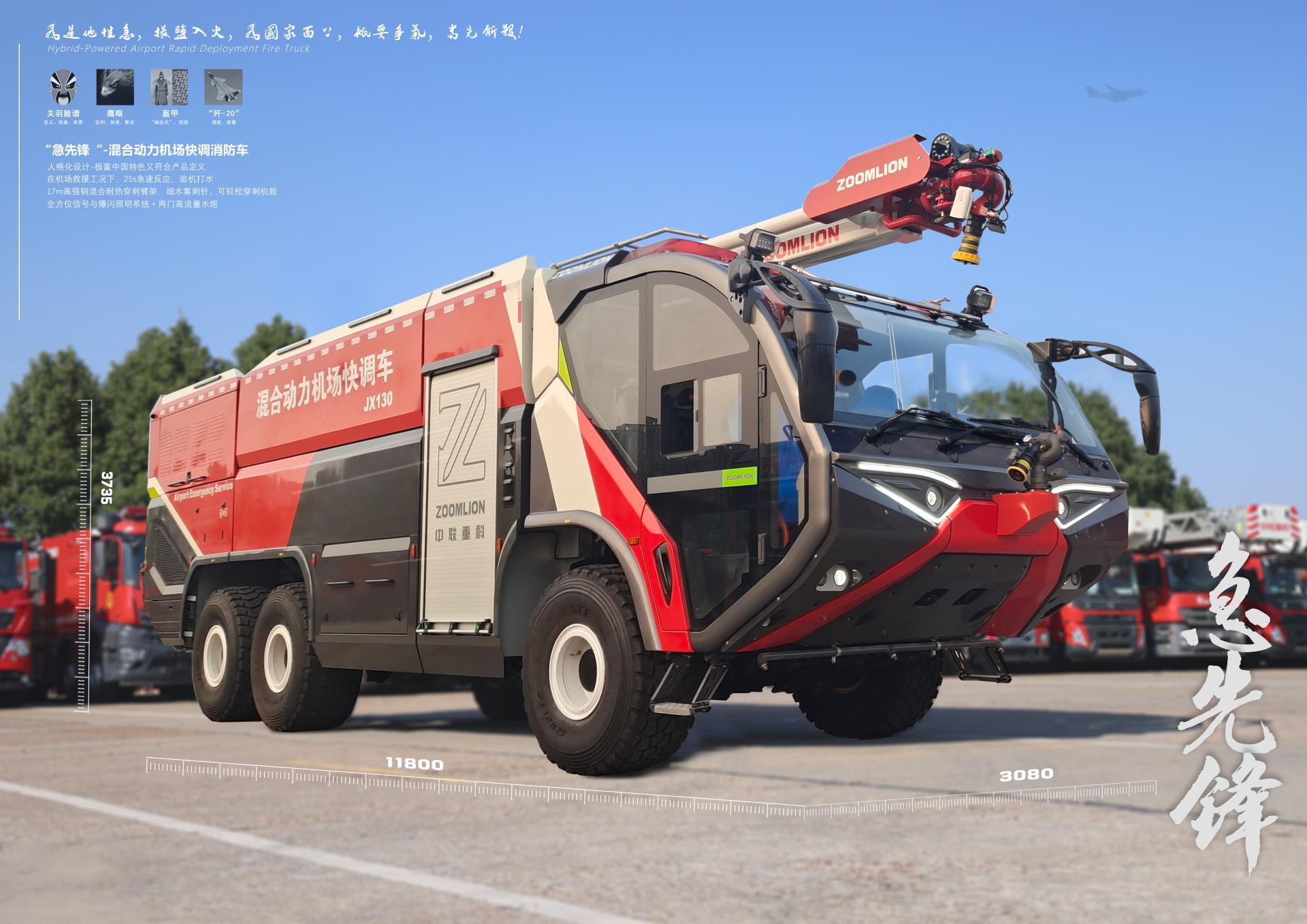 此次大赛中,中联重科混合动力机场快调车获得产品组唯一金奖,其基于我国应急救援“全灾种、大应急”的背景开发,是国内首创混合动力的机场快调消防车,技术水平全球领先。该产品结合电动的瞬时爆发力和燃油的长时间持续灭火救援,瞬时加速时间大幅缩短,同时配备伸缩式+折叠式复合臂架,配置了一键出水、一键展(收)臂等智能化技术,功能全面、实战性强;在非应急工况下可使用清洁能源,实现能量回收,绿色低碳、节能环保。中联重科还将脸谱、传统盔甲-编连式等传统文化元素融入车型设计,通过设计赋予产品“忠义、耿直、英勇”的独特个性,进一步提升产品价值。