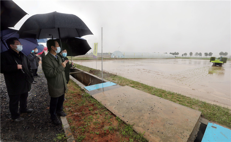 △许达哲观看中联重科智慧农机产业园新下线的高速有序抛秧机演示抛秧作业。图片来源:新湖南客户端