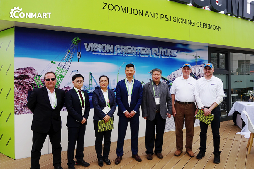 中联重科建筑起重机械公司美洲区经理言欢和P&J Arcomet总裁Stephen Jehle代表双方签约,中联重科北美子公司总经理王曙、中联重科海外公司美洲区经理张思,P&J Arcomet前总裁Peter Jehle,P&J Arcomet财务总监Brian Rolsto共同出席见证了签约仪式。