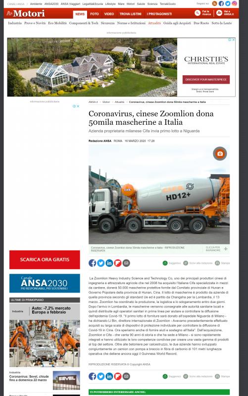 △安莎社积极报道中联重科向意大利捐赠口罩