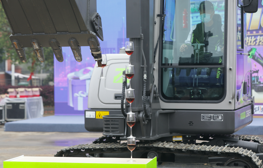 灵动、精准是ZE60E-10挖掘机的显著特点。这一特点在叠高脚杯表演中诠释的淋漓尽致。中联重科产品经理陈江波介绍道:“机手用操作杆控制铲斗,再用铲斗将盛有红酒的高脚杯一个一个叠起来,这个难度自是不言而喻。既需要机手经验丰富,也需要挖掘机得心应手、精准、灵动,达到‘人机合一’来完成这个挑战。”