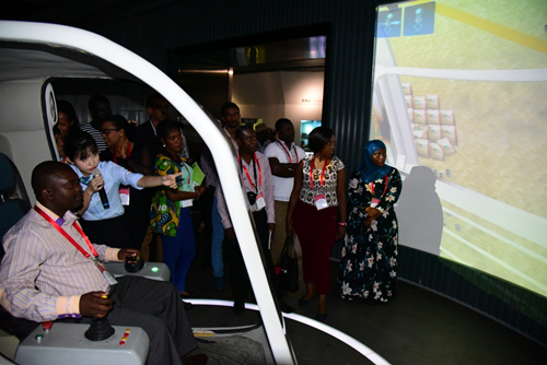 △海外参观者在中联重科工程机械馆内体验塔机模拟操作