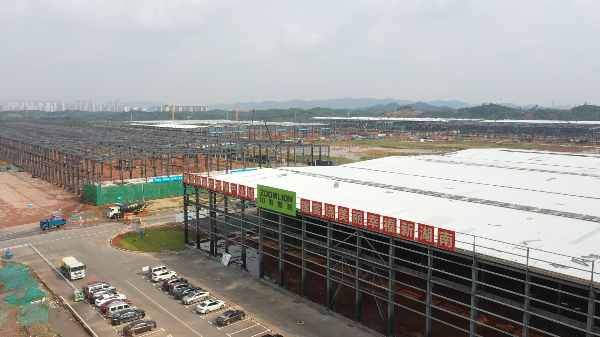 在中联智慧产业城项目建设现场,钢铁森林拔地而起,首开园区挖掘机械制造园区已见雏形。中联智慧产业城将聚集中联重科四大产业板块、四个零部件中心及六个国家级创新平台,以“面向未来、引领世界30年”为目标,新建近200条智能化产线,打造智能化、生态化、国际化的产业新城。
