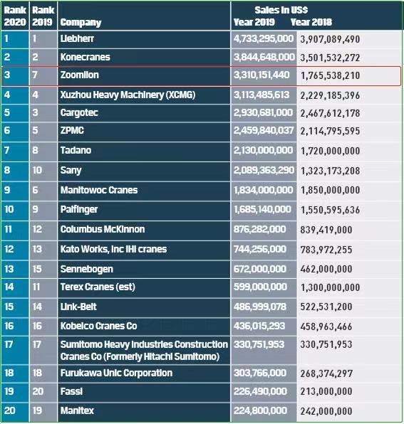 △中联重科位列全球起重机械制造商20强排行榜**三