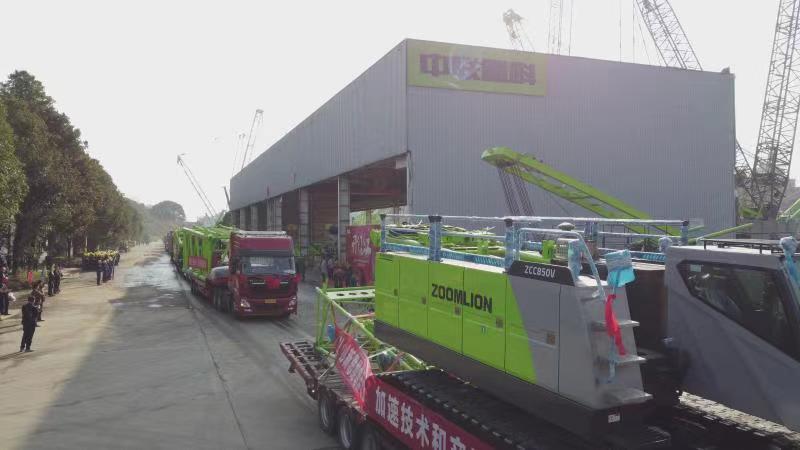 △2月18日,中联重科开门红当天,十余台履带起重机明星产品起运发往全球