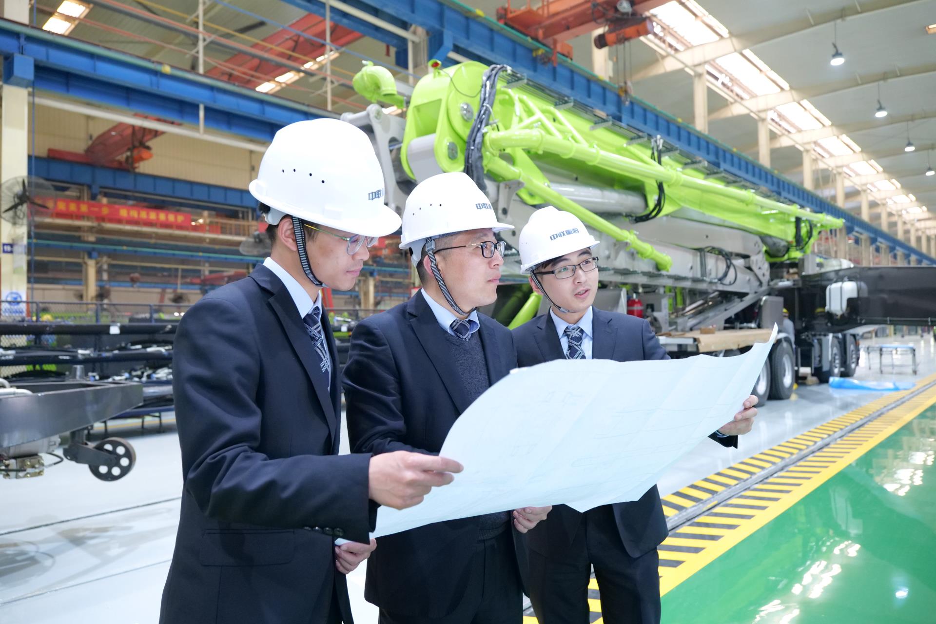 中联重科混凝土泵送机械分公司研发中心经理高荣芝(左一)在车间研究泵车装备。朱莉 摄