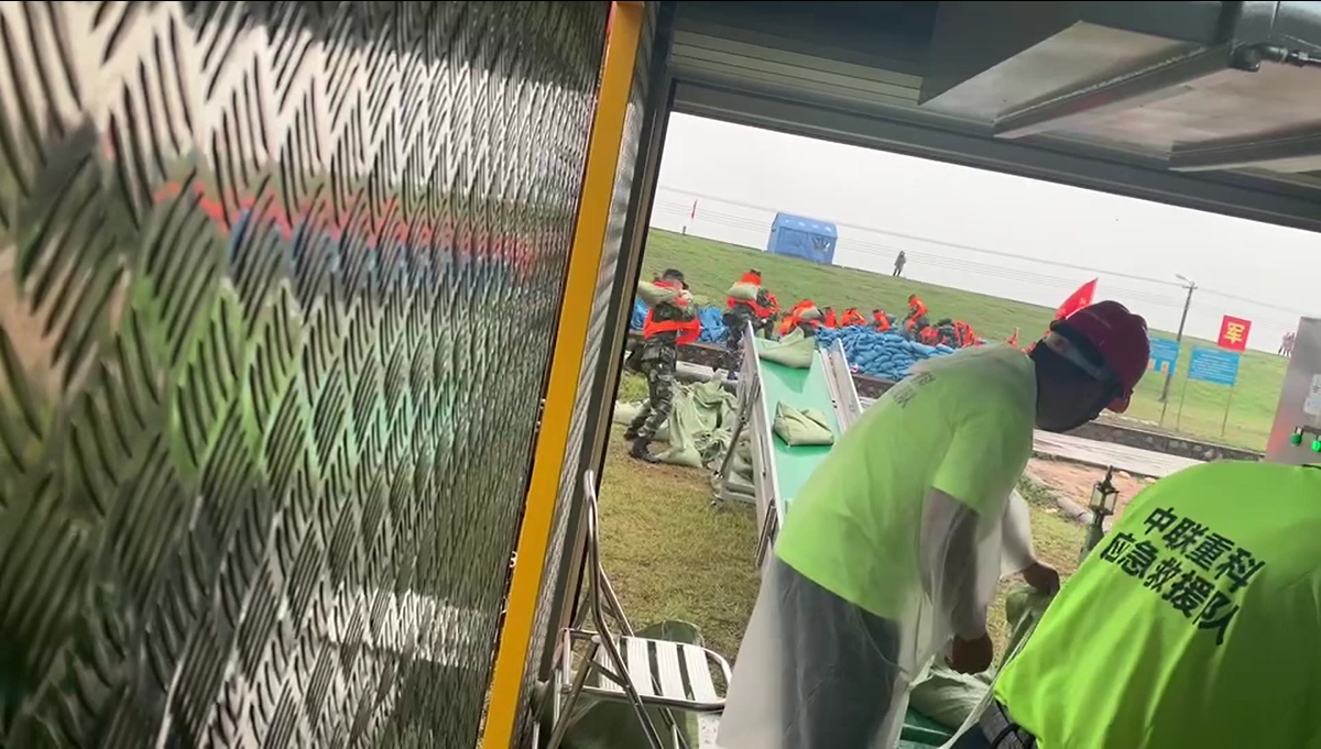 △中联重科救援队员在应急砂石打包模块车中操作