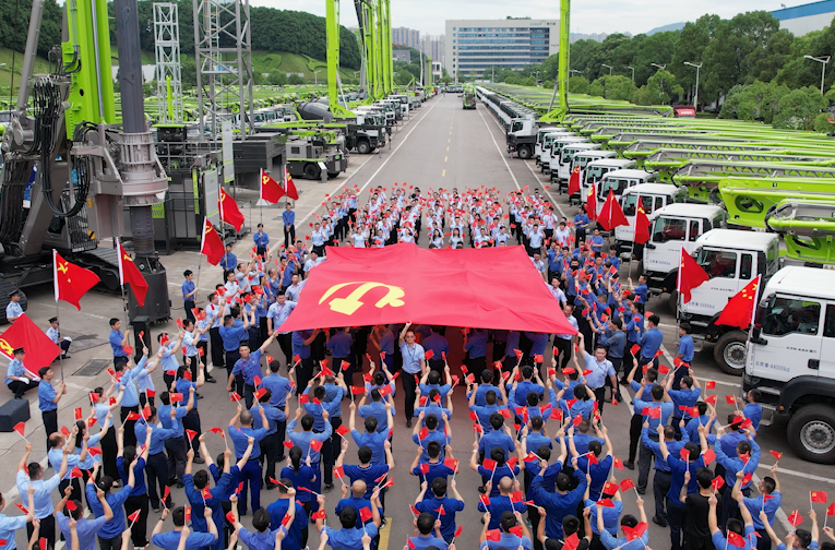 “百年奋斗感党恩,薪火相传千帆竞。中联重科热烈庆祝中国共产党成立100周年!”红歌传唱结束,大家一起挥舞手中的党旗和国旗,为中国共产党百年华诞送出祝福,昭示全体中联人团结奋进的决心。偌大幅面的党旗在队列中传送,中联人“我心向党”的决心亦喷涌而出,一浪高过一浪。