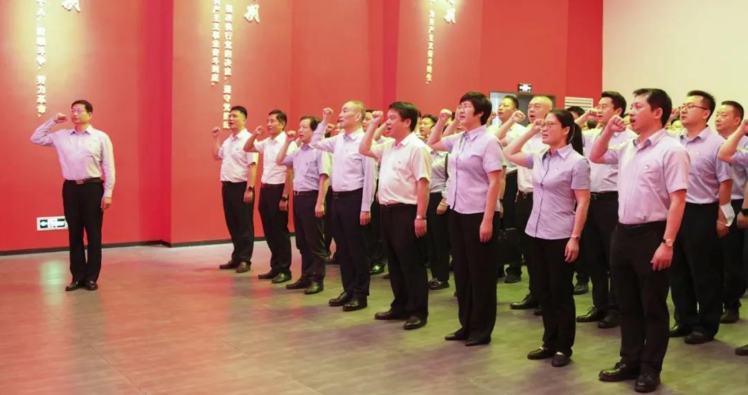 在宣誓大厅,面对鲜艳的中国共产党党旗,全体党员干部重温入党誓词,铿锵有力的宣誓声响彻大厅。
