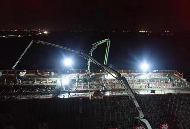 据了解,除了矗立长江中流击水的中联重科万吨米级塔机,中联重科泵车等设备也正在为项目建设提供助力。7月30日凌晨5点,经过8个小时的连续奋战,常泰长江大桥北接线工程CT-TX1标泰兴东枢纽首联现浇箱梁底腹板浇筑完成,项目正式进入上部现浇结构施工阶段。其中负责浇筑的就有中联重科混凝土泵车。