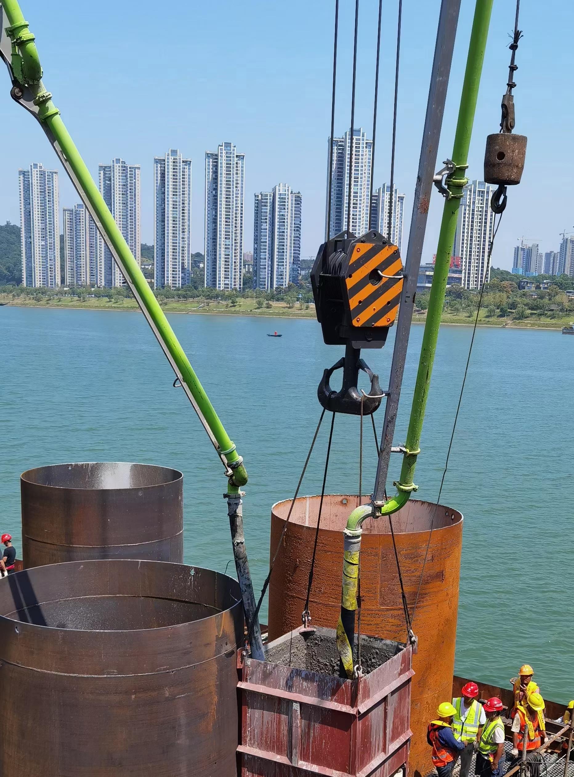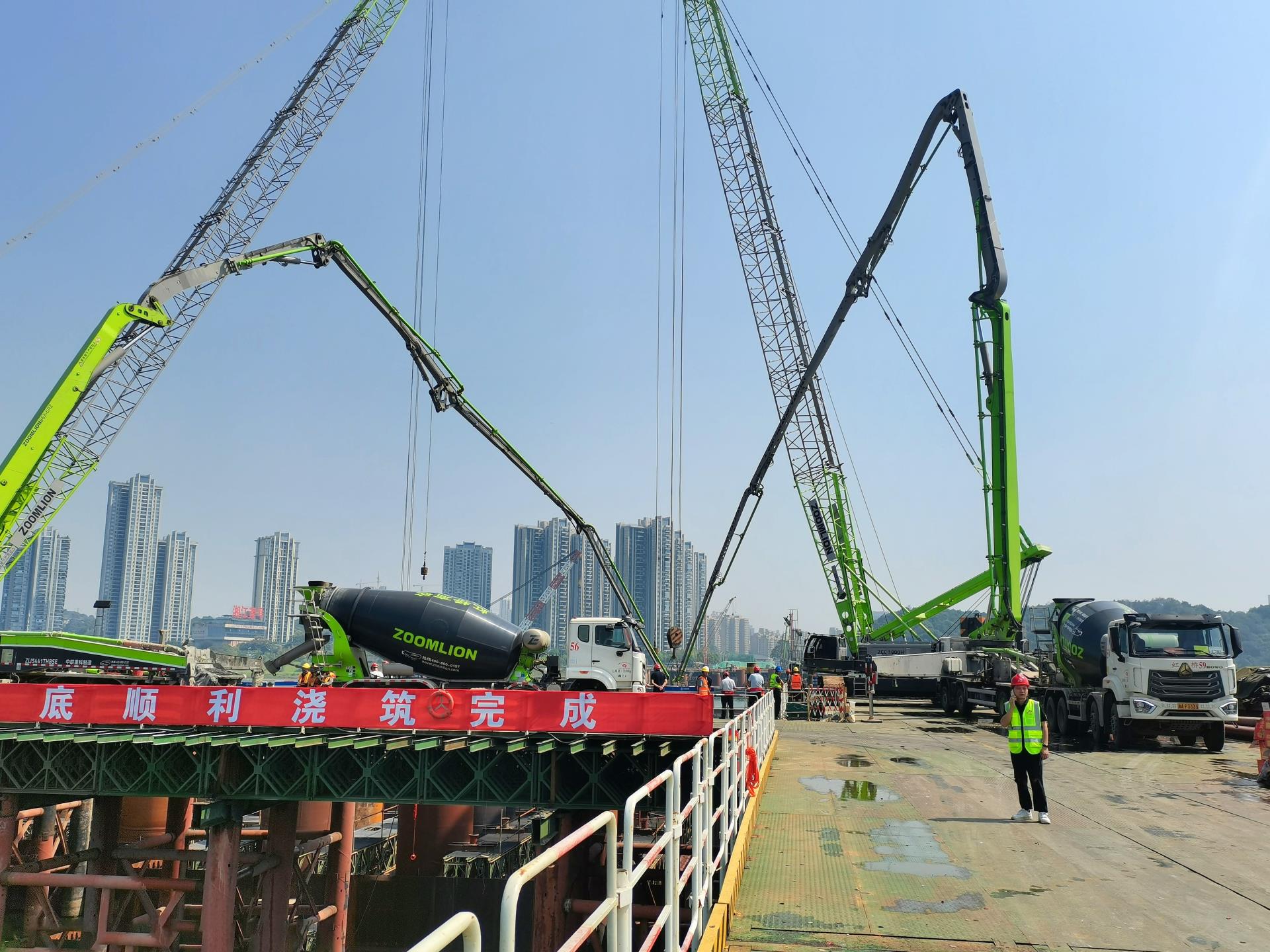 其主墩承台设计为深埋式“哑铃型”,钢围堰封底工作是**关键、也是连续作业时间**长的工序。为确保浇筑品质和效率,施工方经多方对比,**终选择了中联重科“凌云”系列泵车来完成任务。操作机手也对中联重科的泵车情有独钟:“中联的泵车臂架一直都很稳,打料快、油耗也低!”