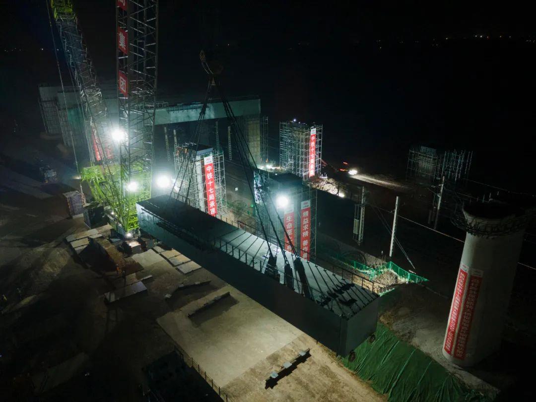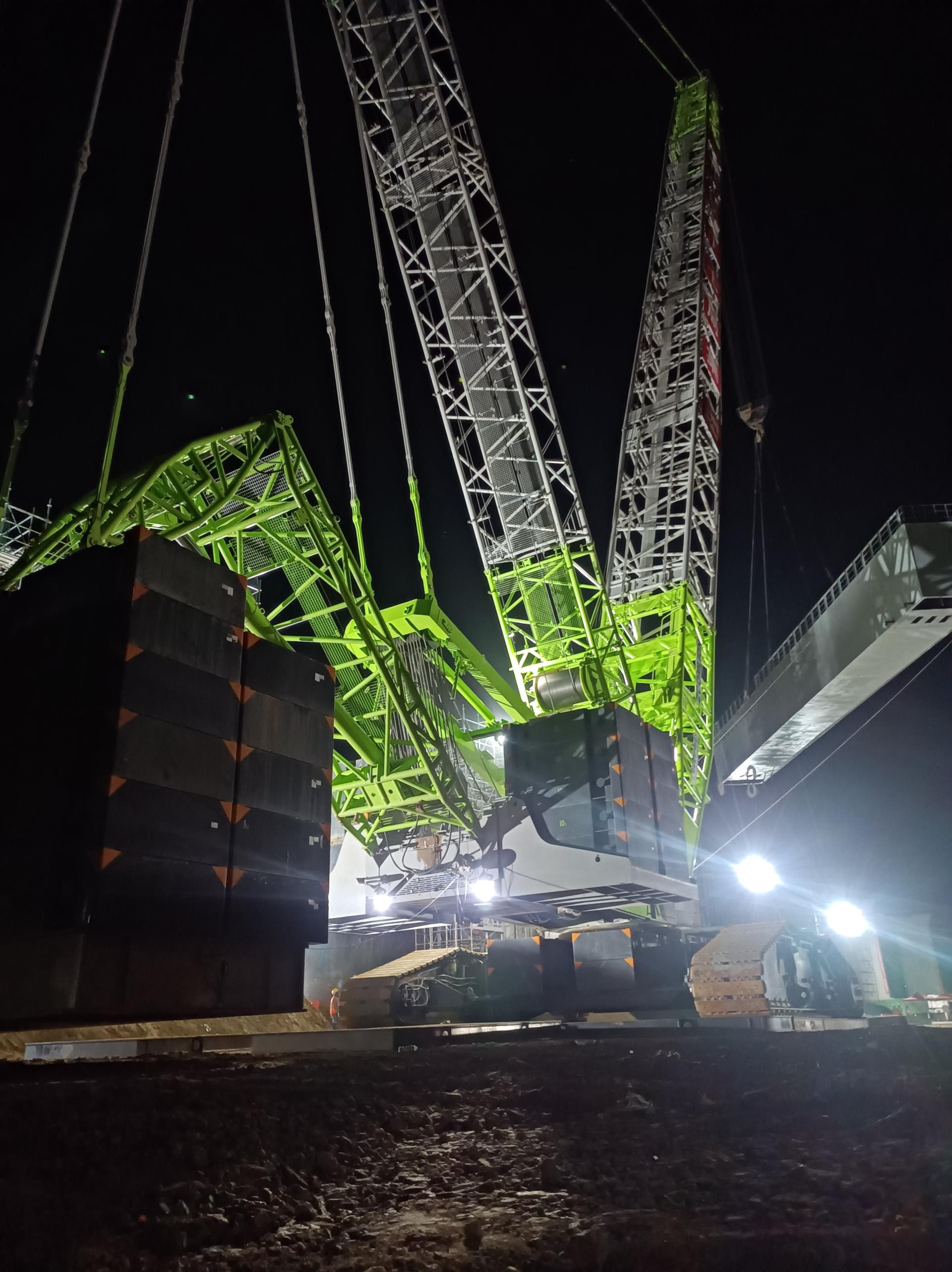 在中联重科履带吊吊装的钢横梁中,有一榀长33.84米,宽4.58米,高3.5米,重达276.4吨,需要将其吊至离地面18米,相当于6层楼的高度,还要平稳落在框架墩上,偏差要控制在毫米级,即使风力的影响都要严格计算,做到“绣花”一样精细。4月20日凌晨,中联重科千吨级履带吊稳稳起吊横梁,旋转、摆正、下落、校正一气呵成,施工用时不到30分钟,赢得项目部高度赞誉。