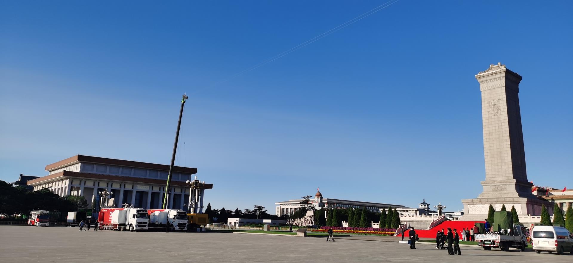 天安门广场南北两侧,两台中联重科“极光绿”汽车起重机吊臂高举,以卓越品质和稳定性能支撑搭建起一条高40米、长300米的空中索道,其搭载的“天鹰座索道摄像系统”以宏大宽广的全景视野完美呈现了整场活动,让全国观众更真切地感受仪式的现场氛围。