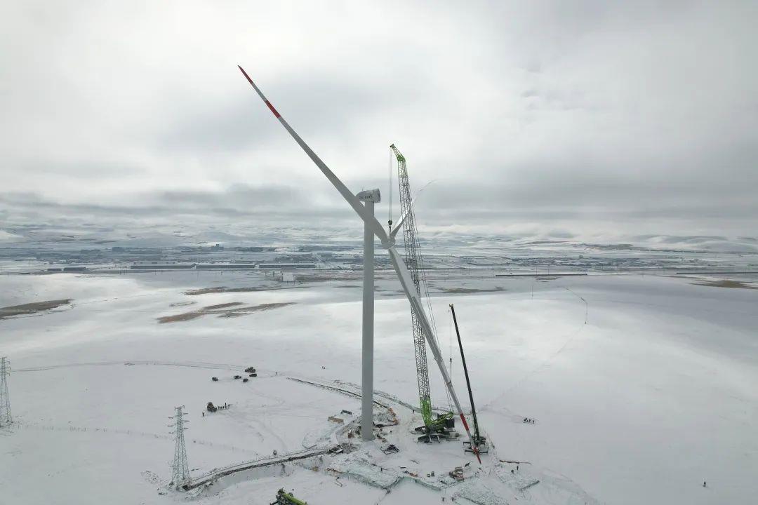 7月7日,中联重科起重机克服当天的暴雨雷电恶劣天气影响,成功吊装首台风机;10月19日,连日降雪大风,当地气温骤降至零下10℃,中联重科起重机圆满完成项目开工以来的雪天首吊;10月28日,项目25台风机全部顺利完成吊装,为年内全容量并网发电目标奠定了坚实基础。