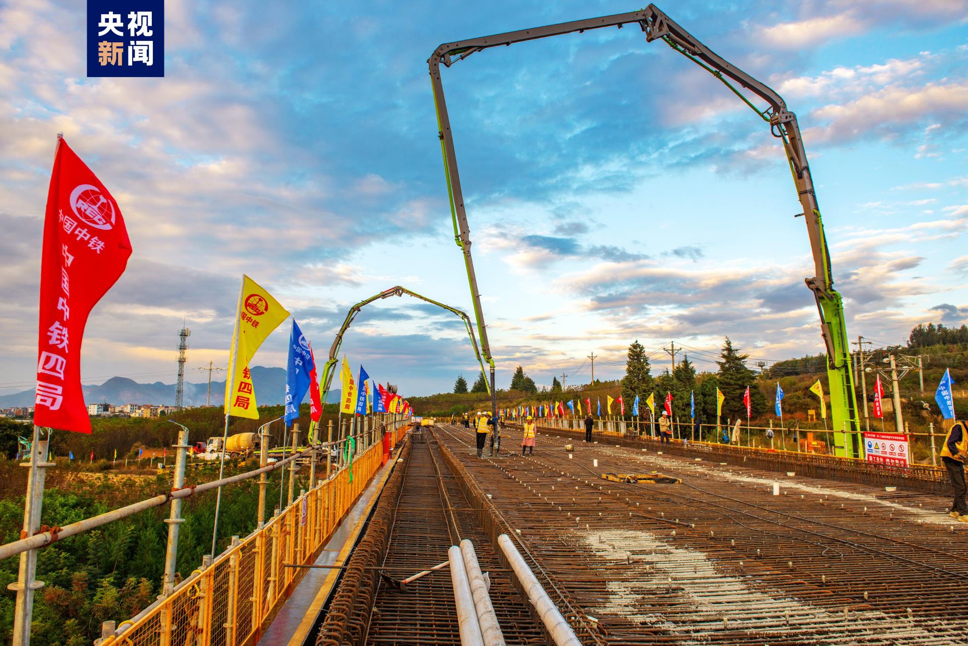 据悉,此次浇筑的云南段首座大桥是嵩明蔡家村3号大桥,位于云南省昆明市嵩明县境内,主跨连续梁为三跨,与沪昆高铁平行、上跨乡村公路,连续梁为钢筋混凝土箱梁,梁面宽度12.6米,梁底宽度5.5米,采用支架现浇法施工。由于大桥结构和工艺的特殊性,浇筑工作需不间断持续进行。