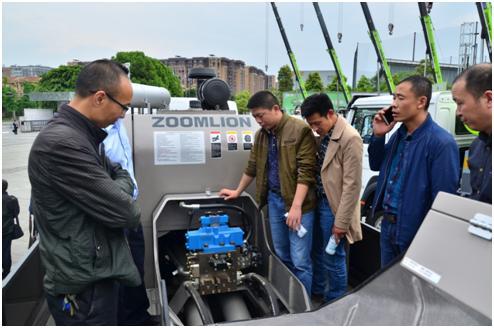 停车坪上,11台全新涂装的4.0设备整齐地排列开来,吸引了无数目光。客户在心仪的4.0产品面前,通过技术人员的讲解进一步了解产品性能。与此同时,中联重科为了让客户更真切地体验设备的智能化特点,在设备观摩现场设置了APP演示区域,客户只需通过手机,就可随时观看中联重科4.0设备的开机自检演示。