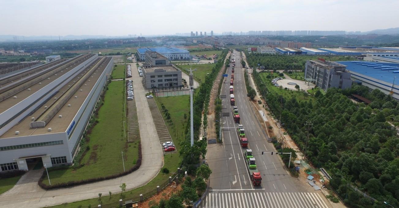 ▲中联重科成套路面机械设备浩浩荡荡从望城工业园出发