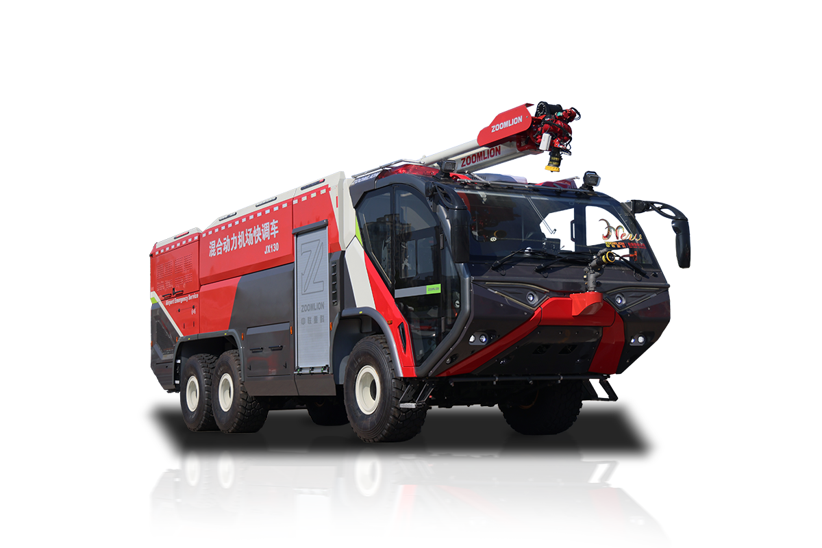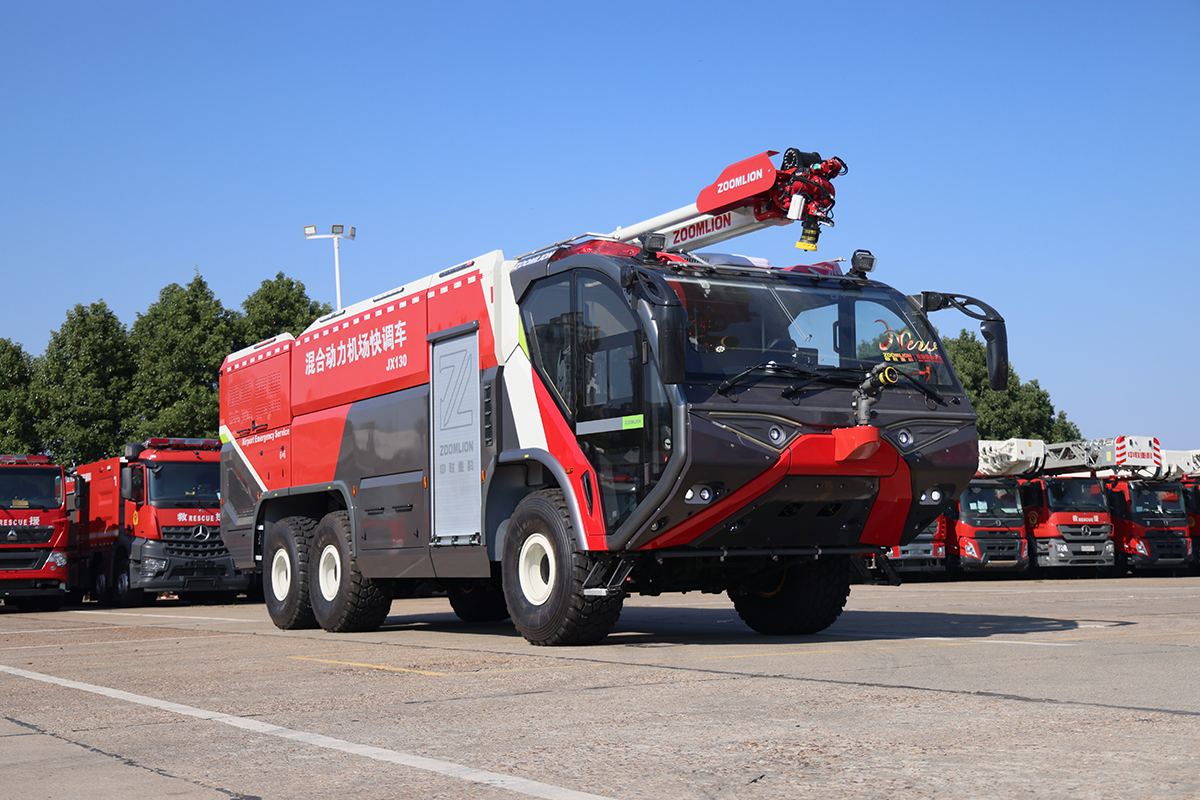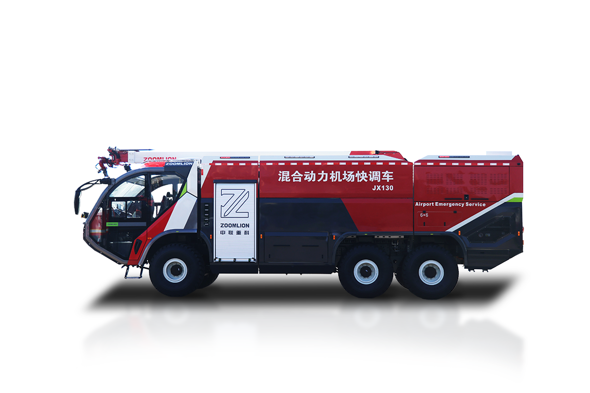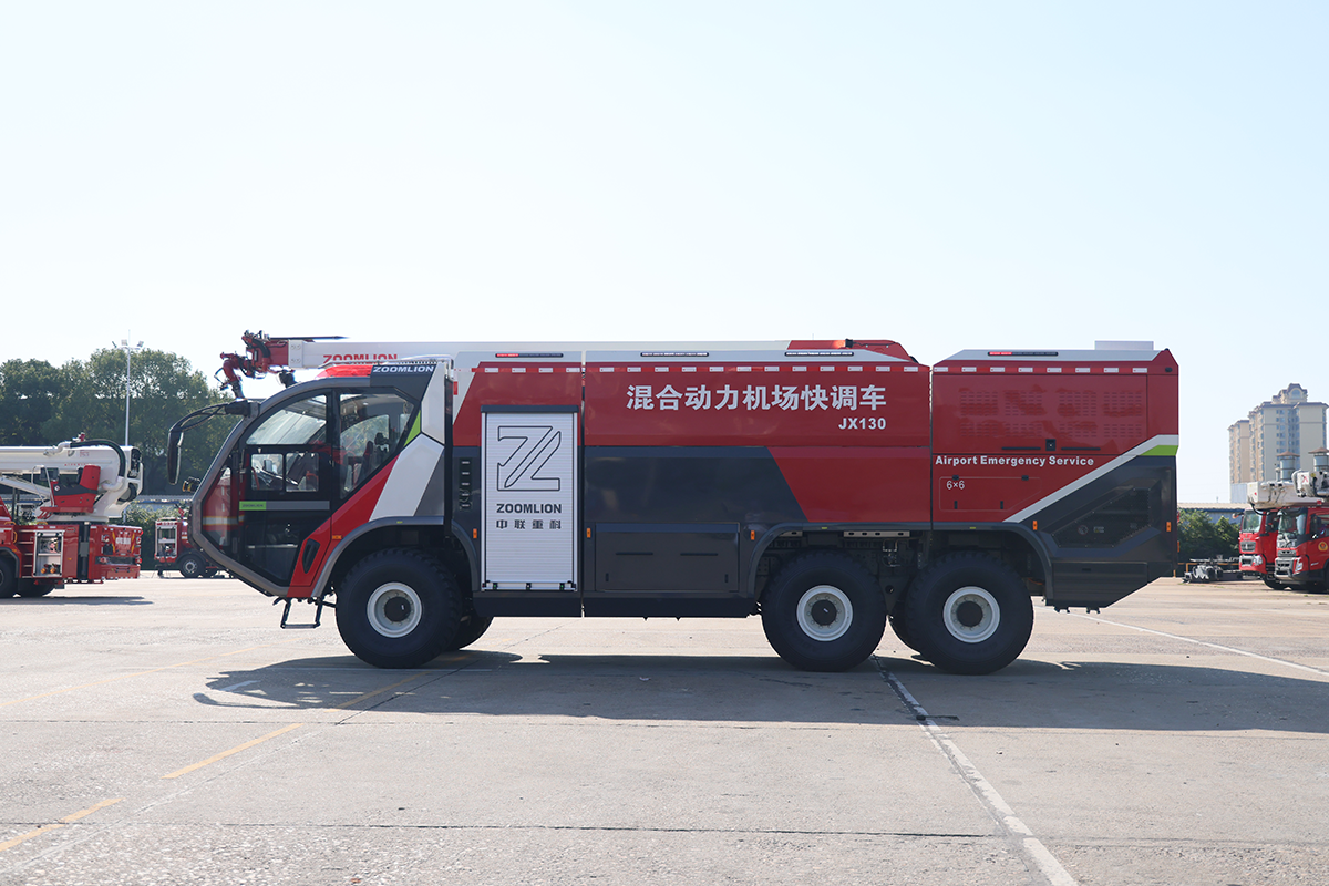 中联牌JX130是国内首款混合动力驱动的机场快调消防车。该车采用双动力驱动,具备超强的行驶加速性能;配有大容量灭火剂罐,搭载智能的灭火喷射系统和高强度穿刺臂,快速扑救飞行器火灾,是各类机场必备的火灾救援核心装备。