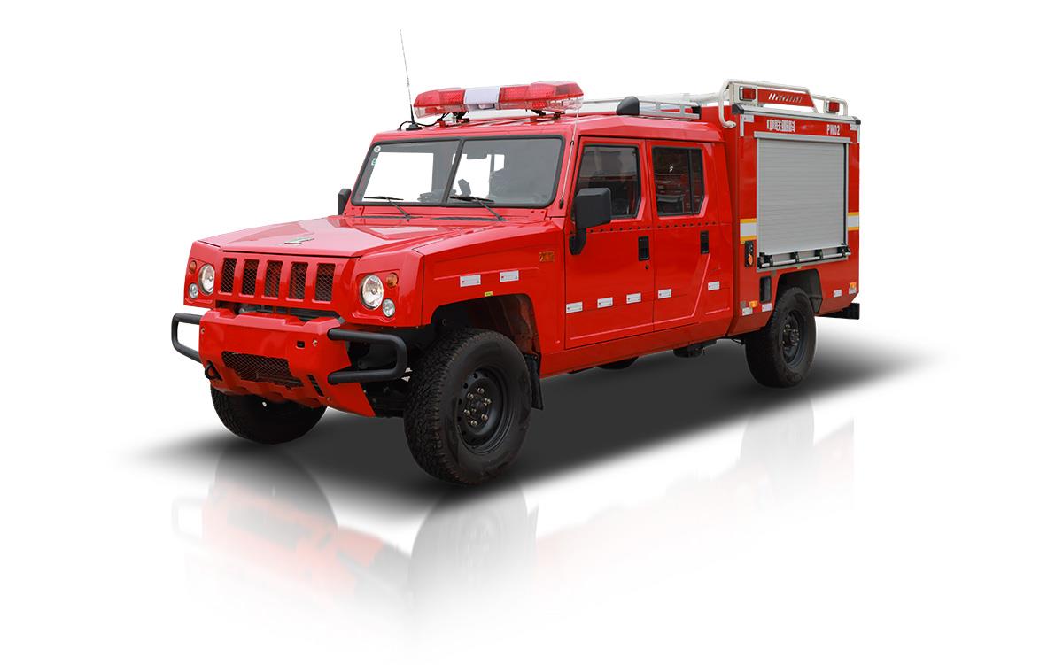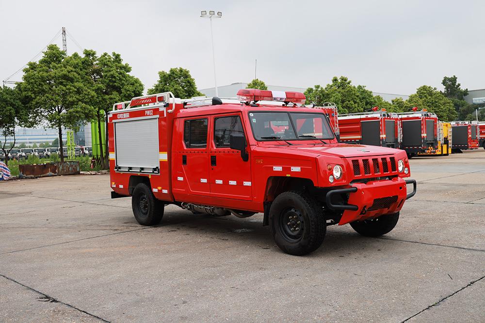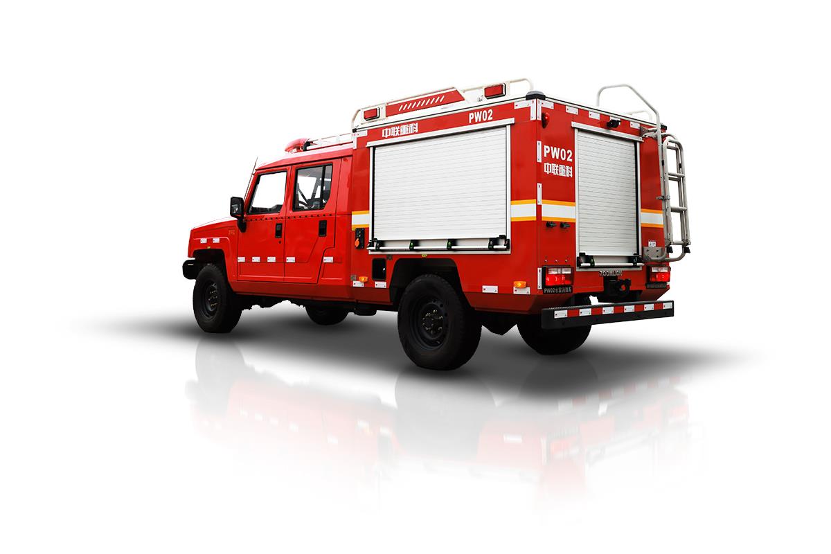 中联重科PW02A6“平战接合型”水雾消防车,在救援队伍行进时,起突前救援及通信作用。搭载高性能细水雾模块,实现前期火灾的扑救,实现打早打小;搭载车载电台与后方无线语音通信,对救援车队起到引导作用。还可搭载危险气体侦测设备、车载绞盘、倒伏式照明灯等器材设备。该消防车由北汽勇士(四驱)改制而成,动力强劲,能适应泥泞、破损等复杂路况,适用于消防、公安、地震等应急救援场景。