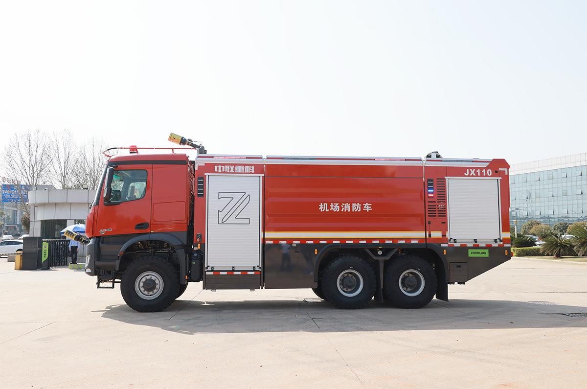 中联牌JX120A6型机场主力泡沫消防车,采用国际知名品牌奔驰6×6特种商用越野底盘改装,底盘动力强劲,搭载自动变速箱,加速快,车速高,救援更高效;消防水泵由独立专用大功率发动机驱动,行进中可随时开启消防系统灭火;配有大容量灭火剂罐,搭载智能灭火喷射系统,操作简单,在驾驶室内即可完成所有灭火救援操作,能快速扑救飞行器火灾,是各类机场必备的火灾救援主力装备。