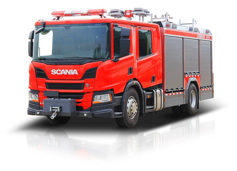 ZLF5180GXFAP45型城市主战消防车选用原装瑞典斯堪尼亚(SCANIA) 5P410 4×2型二类底盘、装备进口全自动压缩空气A类泡沫系统改装而成。整车外形美观、设计科学、匹配合理。