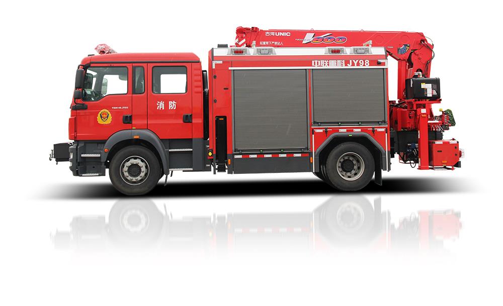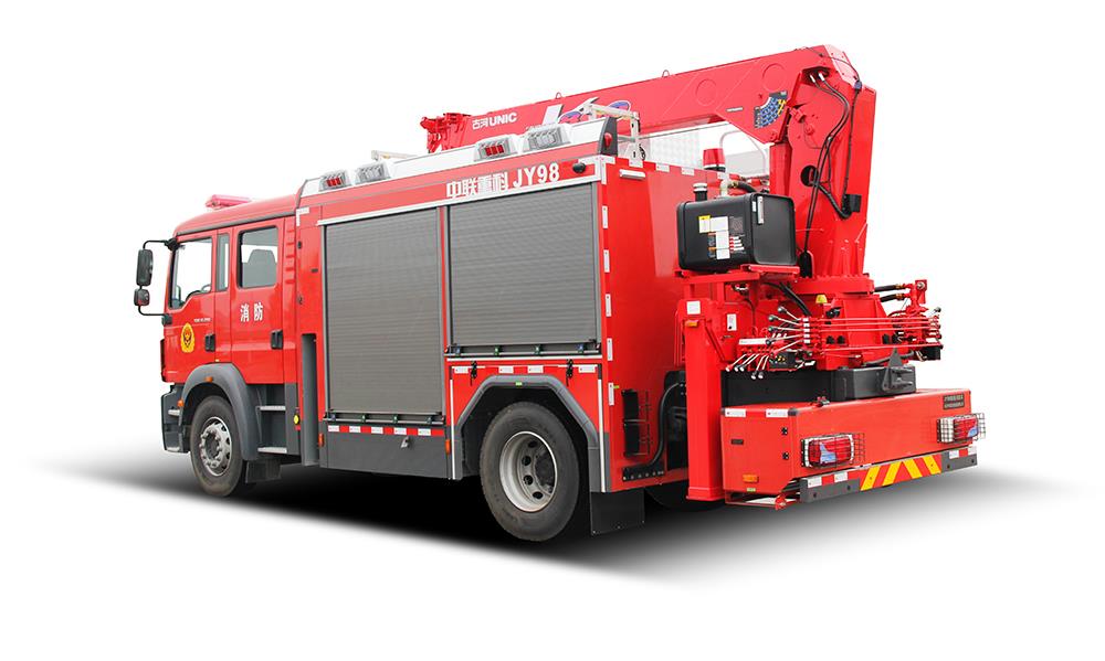 中联重科JY98型抢险救援消防车,结合国内外消防车的先进理念和消防实战创新设计而成,整车结构紧凑,越障能力强,可装备绞盘、升降照明系统、起吊机、液压破拆工具组、侦检器具、救生器具等超过98件抢险救援器材,是集照明、供电、牵引、起吊、破拆、侦查、救援等功能于一体的多功能消防车,具备强大的抢险功能和综合救援能力,是火灾、地震、抗洪、车祸等各类灾害抢险救援的主力车型。