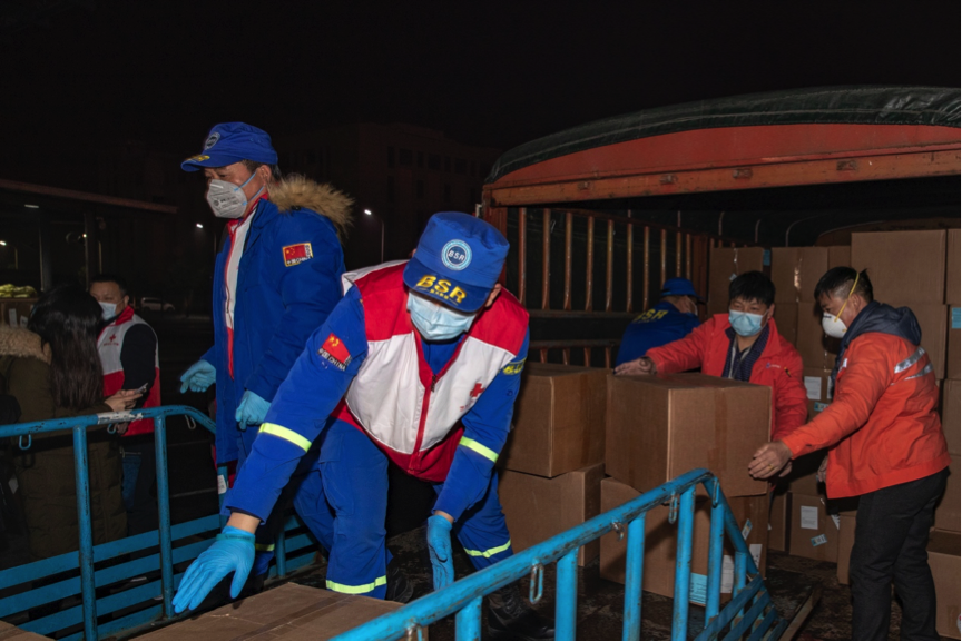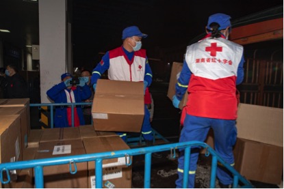 △中联重科采购的疫情防护物资运抵长沙后立即交接给湖南省红十字会