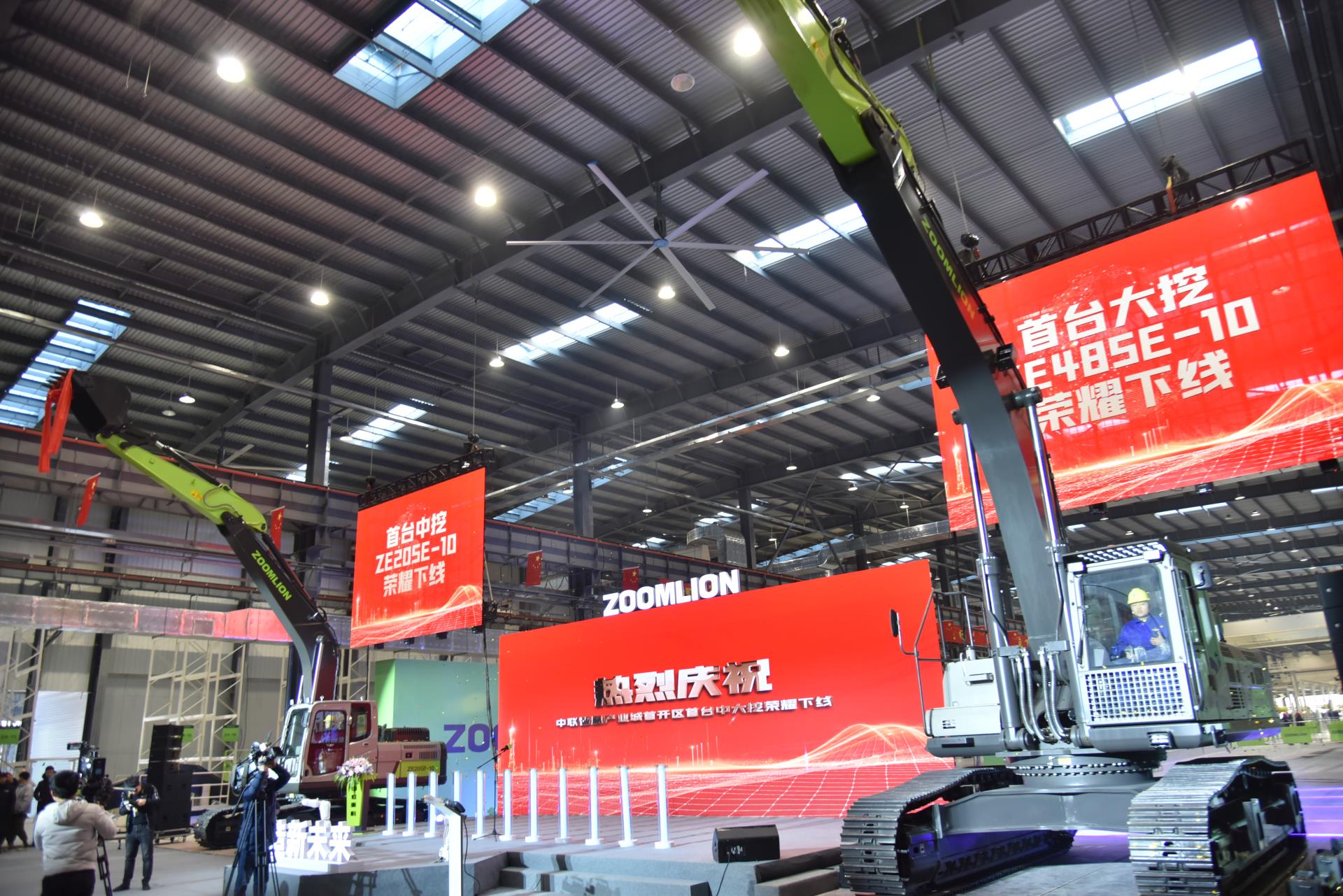 据了解,此次下线的两款产品分别为20吨和48吨级挖掘机,两台挖掘机均属于中联重科E-10系列产品。20吨产品机型为ZE205E-10,整车重21.5吨,是中联重科针对土石方工程研发的中型挖掘机,有着节能、高效、可靠等特点。另一款大挖产品为ZE485E-10,整车重48.5吨,主要应用于矿山破碎开采、装车运输等工况,有着“矿世英雄”的美称。